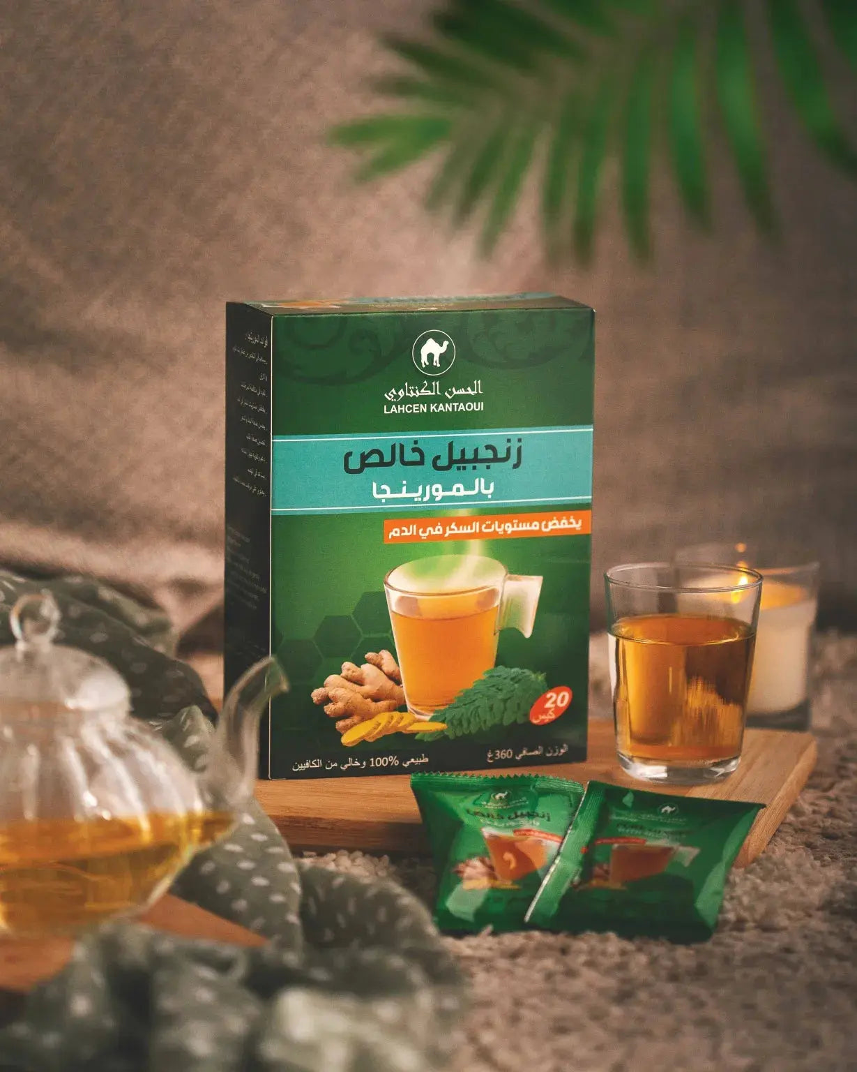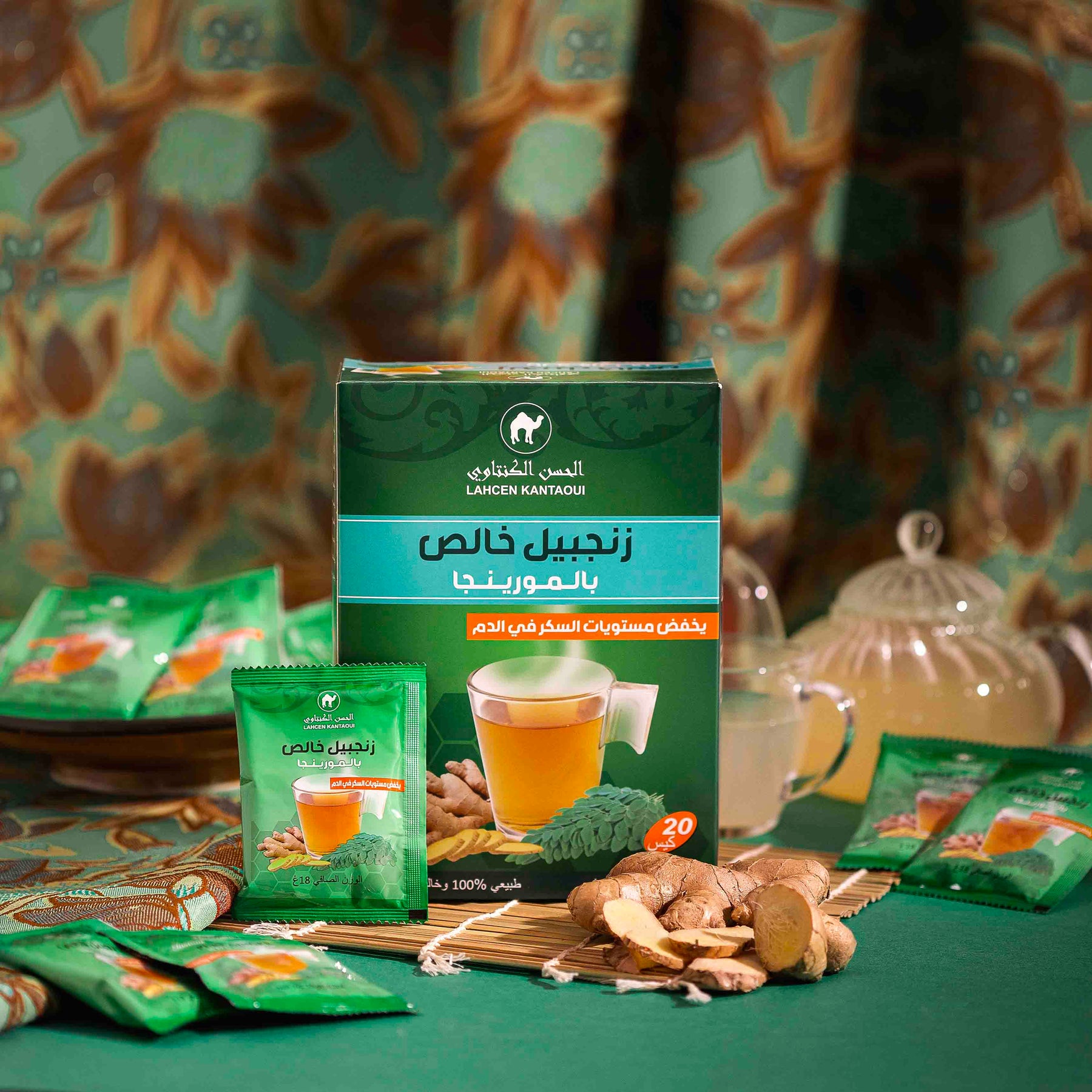 Lahcen Kantaoui ginger tea with milk and ginger coffee boxes, 20 sachets, displayed with Moroccan pastries and teapot.